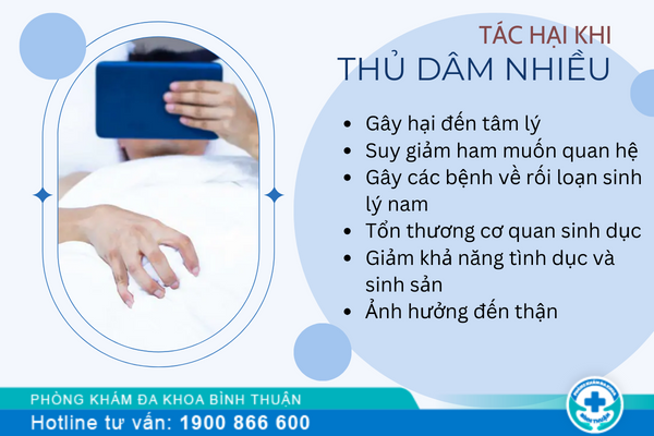 Việc lạm dụng thủ dâm quá mức sẽ khiến nhiều nam giới nghiện thủ dâm, trong đầu luôn suy nghĩ về chuyện tình dục. Nếu quá đà, sẽ dễ dẫn đến lệch lạc tính dục, suy nhược cơ thể, đau tình hoàn, suy giảm trí nhớ.