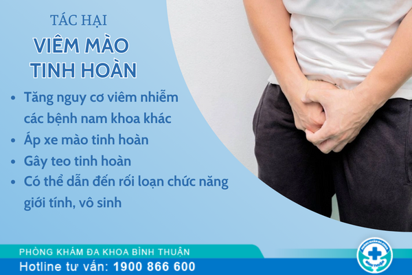 Có thể dẫn đến rối loạn chức năng giới tính, vô sinh: Tinh hoàn là cơ quan đảm nhiệm chức năng sản xuất tinh trùng và tiết ra hormone quy định giới tính nam, khi một bộ phận bị viêm nhiễm kéo dài thì chức năng này bị suy giảm nghiêm trọng… chất lượng tinh trùng giảm sút, tinh trùng chết gia tăng gây tắc ống dẫn tinh dẫn đến vô sinh và nam giới có nguy cơ dần bị “nữ hóa”.